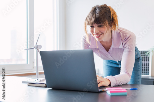 happy, businesswoman, working, laptop, desk, happiness, smiling, environment, ecology, sustainability, technology, 1, people, computer, communication, adult, online, business, woman, day, occupation, job, using, cyberspace, connection, wireless, green, renewable, energy, mid, leaning, caucasian, office, table, model, bending, wind, turbine, female