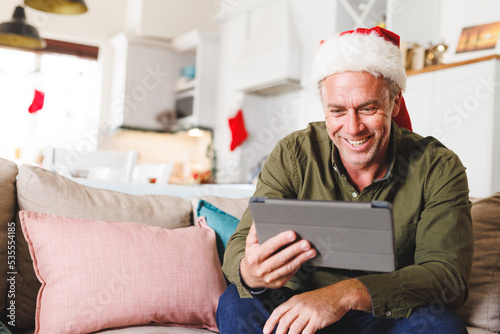 Happy caucasian man wearing santa hat, sitting on sofa in living room, using tablet