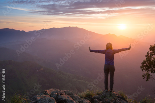 sunset, mountain, travel, hiking, freedom, top, view, adventure, peak, woman, success, sky, horizon, girl, traveler, nature, holiday maker, extreme, summer, hike, sunrise, rock, hill, activity, trekking, young, sport, high, people, lifestyle, backpack, stone, journey, standing, sunlight, climbing, tour tourism, leisure, female, sun, silhouette, victory, happy, sea, cliff, looking, endurance, cloud, lady