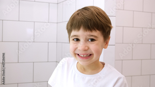 Happy child looks at the camera and smiles. Cute caucasian 6 year old boy in white t-shirt. Close-up portrait. Concept of happiness and good mood. Cheerful kid. Pretty face. Home bathroom background