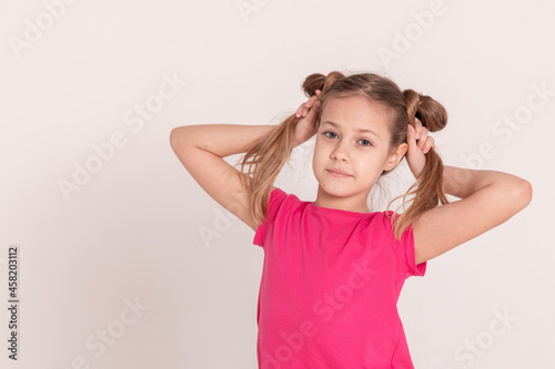 happy child on a white background. a girl in a pink T-shirt and pants.
