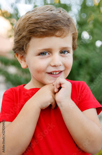 Happy child with red t-shirt in the garden