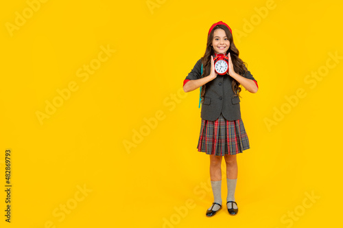 happy childhood. child with alarm clock. copy space. cheerful teen girl carry backpack.