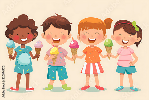 Happy children enjoying ice cream cones on a sunny day, capturing joyful summer moments.