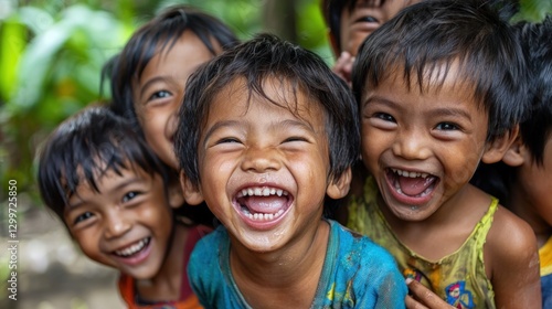 children, children, happy, laughing, smile, joy, fun, playful, cheerful, giggling, friendship, group, togetherness, community, childhood, carefree, innocent, vibrant, energetic, lively, smiling, face, expression, emotion, happiness, excitement, delight, glee, gleeful, amusement, outdoors, nature, green, background, summer, warm, sunny, bright, light, closeup, portrait, people, human, family, sibling, asian, boy, girl