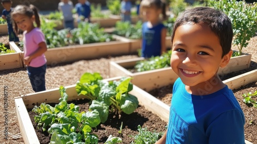 Happy children planting vegetables in outdoor school garden