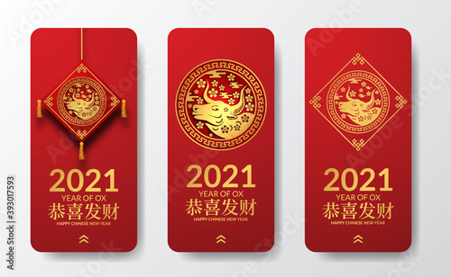 happy chinese new year. 2021 ox year. golden decoration for stories social media template.