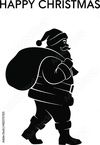 santa, claus, christmas, holiday, festive, celebration, december, winter, gift, present, sack, bag, deliver, delivery, walk, walking, silhouette, black, graphic, symbol, cartoon, character, traditional, classic, merry, greeting, season, seasonal, eve, north, pole, beard, hat, coat, boot, spirit, joy, happy, happiness, cheer, cheerful, art, design