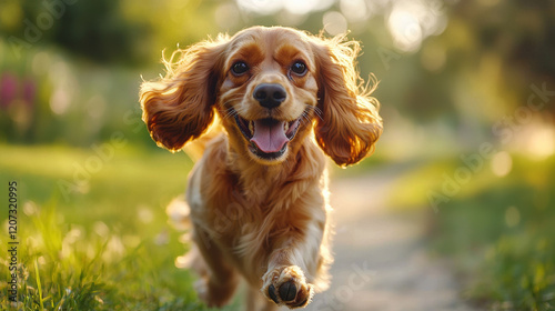 happy Cocker Spaniel running on sunny path in green park, with its ears flapping and tail wagging, radiating joy and energy