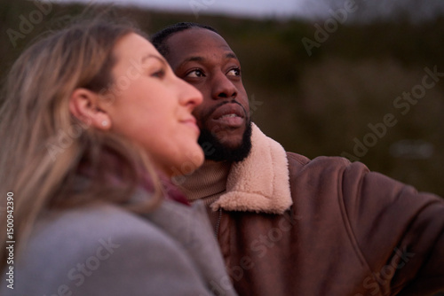 man, woman, adult, mid, couple, heterosexual, smile, group, gem, blond, brunette, jacket, coat, love, togetherness, affectionate, romance, enjoyment, landscape, diversity, britain, people, outdoors, dusk, horizontal, african, 2