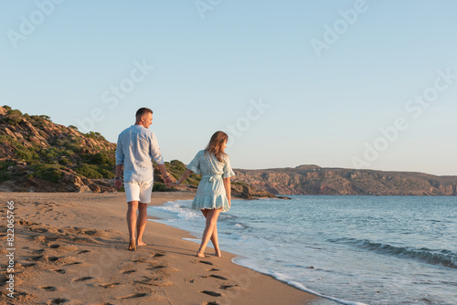 Happy couple is walking on the beach during sunset or sunrise. Summer vacations.