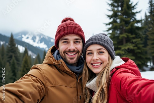 couple, selfie, winter, mountain, vacation, happy, smiling, winter clothes, man, woman, snow, landscape, outdoors, nature, travel, romantic, affection, love, cold weather, jacket, hat, beanie, scenic view, mountain scenery