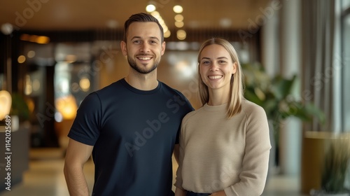 Happy couple standing together in a modern, well-lit interior with blurred background, exuding positivity and warmth.