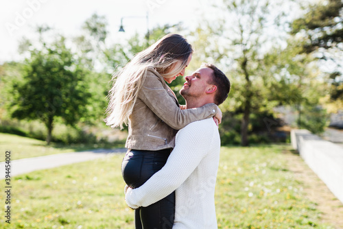 hug, closeness, relation, young couple, people, woman, man, love, adult, togetherness, love affair, couple, kissing, kiss, partner, laughing, happy, blond, jump, spring, together, leisure, smiling, summer, outdoors, waist up, horizontal, two people, day