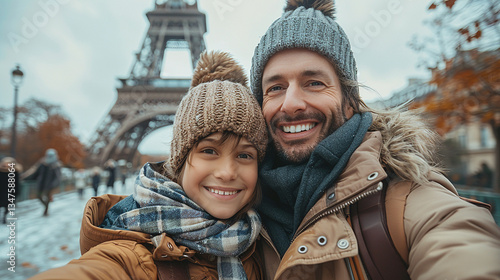 happy, couple, taking, selfie, children, front, famous, holiday maker, landmark, vacation, memory, dynamic, background, happy family, father and son, togetherness, healthy lifestyle, weight loss, meditation