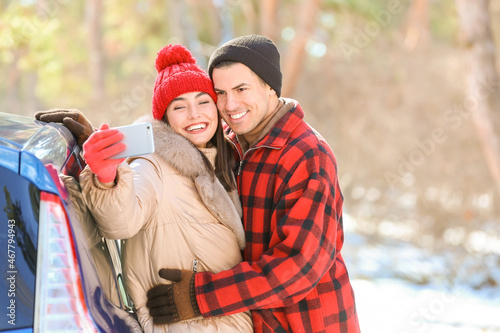 Happy couple taking selfie near car on winter day