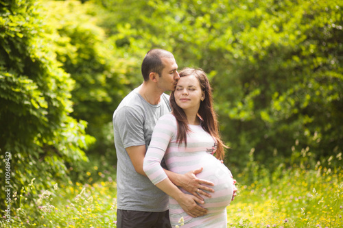 Happy couple waiting for baby. Man kisses pregnant woman and hugs her belly outdoors in summer, New family concept. Paternity.