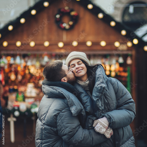 Happy couples on the city square decorated for a Christmas market