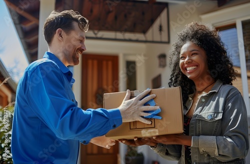 delivery, client, home, service, package, parcel, doorstep, box, cardboard, smiling, happy, friendly, receiving, holding, handing, shipping, delivering, transport, logistic, cargo, freight, container, international trade, commerce, courier, driver, front door, residential, retail, e-business, consumer, purchase, order, fulfillment, happiness, positive, daytime, outside, doorway, suburban, front yard, house