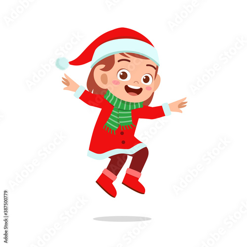 happy cute little kid boy and girl wearing red christmas costume and jump