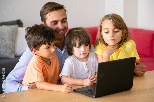 Happy dad and kids watching movie via laptop together. Caucasian father sitting at table and embracing cute children. Boys and girl looking at screen. Fatherhood and digital technology concept
