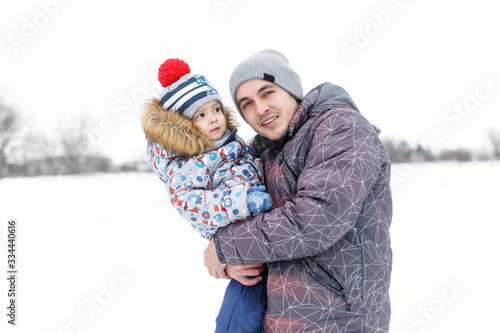 Happy dad holding his son, little funny kid boy on arm, on cold day, walking together in a park in spring, autumn or winter. Happy, joyful family.