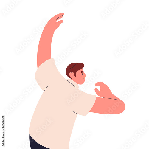 Happy dance of excited man. Young joyful person dancing, having fun, celebrating smth at party. Male character moving to music with joy. Flat graphic vector illustration isolated on white background