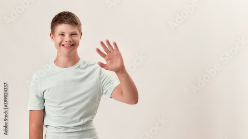 Happy disabled boy with Down syndrome smiling and waving at camera while posing isolated over white background