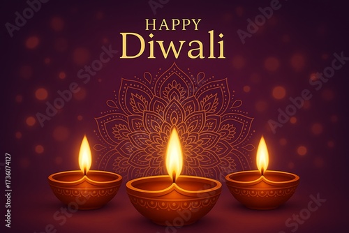 Happy diwali greeting with glowing clay diyas shining brightly mandala art background golden flame symbolizing traditional indian festival of lights sacred culture radiant festive joy