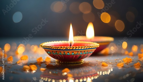 Happy Diwali Hindu festival of lights with celebration background. Indian religions. Burning diya oil lump. Panorama Deepavali.