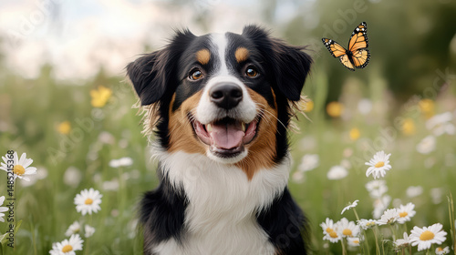 dog, field, daisy, butterfly, happy, nature, pet, animal, summer, green, flower, cute, playful, portrait, smiling, vibrant, wildlife, scene, beauty, companion, grass, sunny, joyful, closeup, furry, meadow, colourful, peaceful