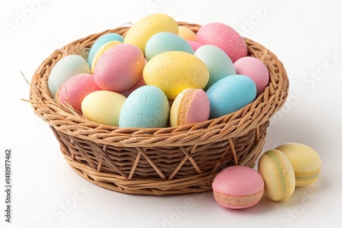 Happy Easter celebration concept. Easter basket filled with colorful eggs isolated on white background