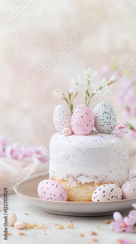 Happy Easter concept with easter eggs, Easter cake and spring flowers