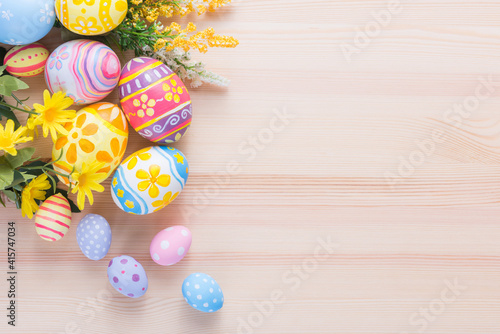 Happy Easter day colorful eggs and flower decoration on wood background with copy space