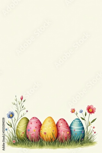 easter, greeting, holiday, egg, rabbit, spring, celebration, colourful, happy, joyful, festive, seasonal, card, illustration, design, decoration, floral, sun, grass, garden, nature, daisy, pretty, vibrant, pois, family, children, fun, celebrate, tradition, egg, flower, sky, green, season, vector, yellow, easter egg, colours, frame, art, meadow