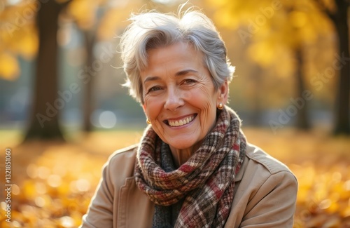 Happy elderly 65 year old woman smiles in autumn city park among fallen leaves. Pensioner active lifestyle concept. Portrait of beauty people in nature. Grey haired lady outdoors.