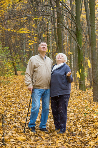 Happy elderly couple walking in an autumn park