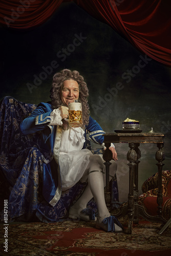 Happy elderly man, dresses as medieval person, king drinks alcohol drink, beer against vintage studio background. Concept of comparisons of eras, fusion of modernity and history, Oktoberfest. Ad