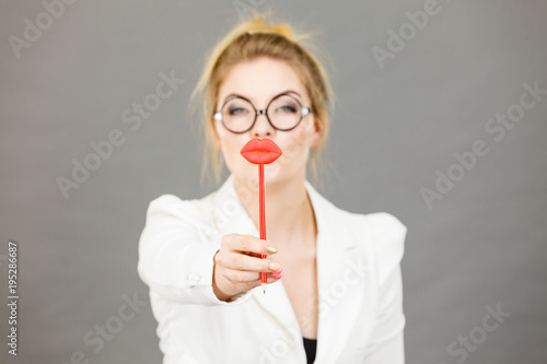 woman, stick, carnival, eyeglass, work, office, elegant, job, fake, fun, funny, accessory, lip, hair, grey, goggles, spectacle, shirt, holding, blond, blond, party, happy, face, hipster, photo, playful, cheerful