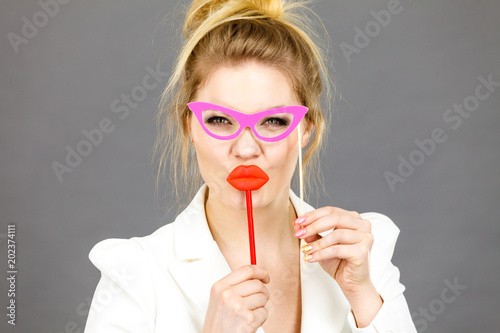 woman, stick, carnival, eyeglass, work, office, elegant, job, fake, fun, funny, accessory, lip, hair, grey, goggles, spectacle, shirt, holding, blond, blond, party, happy, face, hipster, photo, playful, cheerful