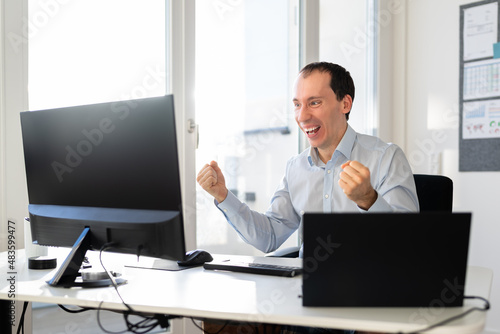 video, computer, desktop, conference, working, man, excited, office, chat, business, happy, at, stock, succeed, celebrate, using, datum, job