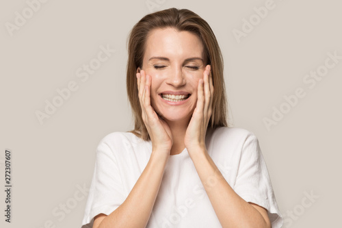 Happy excited young woman with healthy smile touching cheeks
