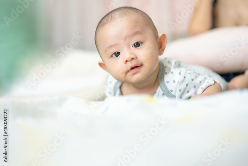Happy family, Cute Asian newborn baby lying play on bed looking at something. While your mother takes care with love nearby. Innocent little boy on the first day of his life. Mother's Day concept.