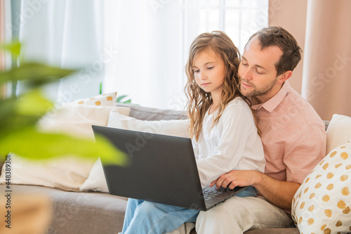 Happy family, daughter sitting on her father's lap on couch at home looking at laptop monitor together.