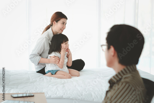 Happy family having fun and spending time together in the bedroom, father work at home while mother and daughter are playing around, parents and little child at home