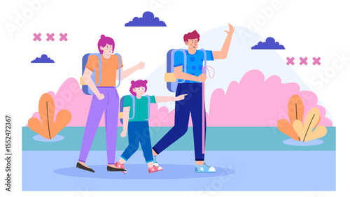 Happy family hikes outdoors carrying backpacks enjoying nature. Suitable for outdoor adventure, family bonding, hiking, nature appreciation, and recreation promotions.