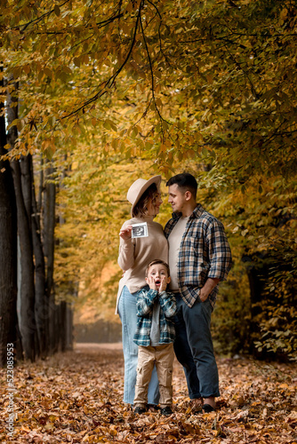 Happy family of a man with a woman holding an ultrasound pregnancy picture and a surprised son who will be the older brother. Autumn photo shoot of a family waiting to be replenished
