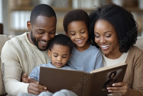 family, children, photo album, reading, smiling, happy, joyful, home, togetherness, bonding, love, father, mother, children, african american, couch, indoor, leisure, memory, childhood, human relationships, care, warmth, cosy, relax, activity, engagement, children, fatherhood, motherhood, family time, parenting, children, family life, smile, together, close, fun, pleasant, sitting, happiness, affection, intimacy