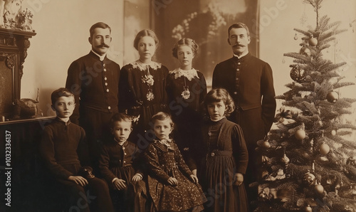 Happy family on Christmas Eve, old vintage photo, generated ai