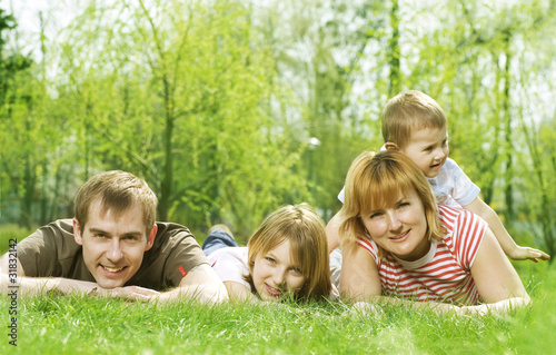 Happy Family outdoor lying on green grass